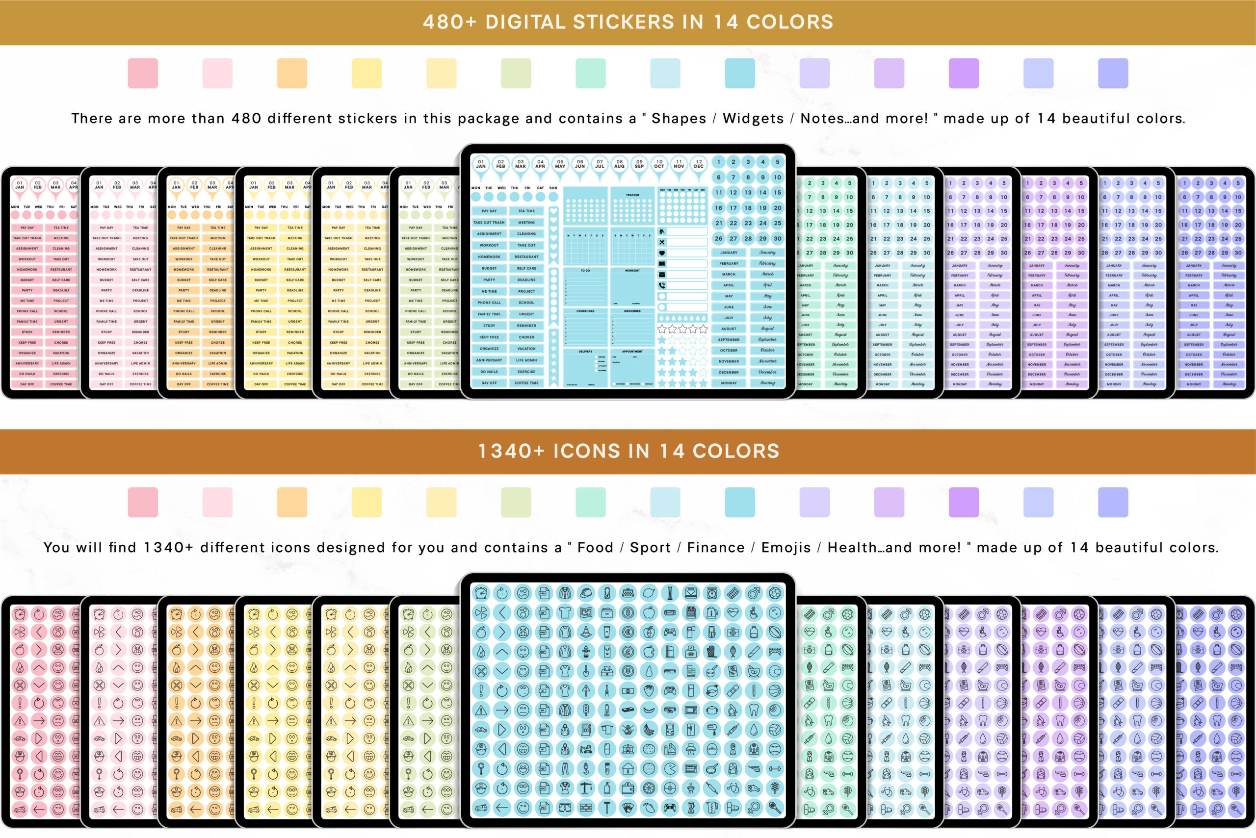 ✔︎ FREE 480+ pre-cropped digital stickers ” Shapes / Widgets / Notes and much more! ” in 14 beautiful color palettes (individual PNG files)