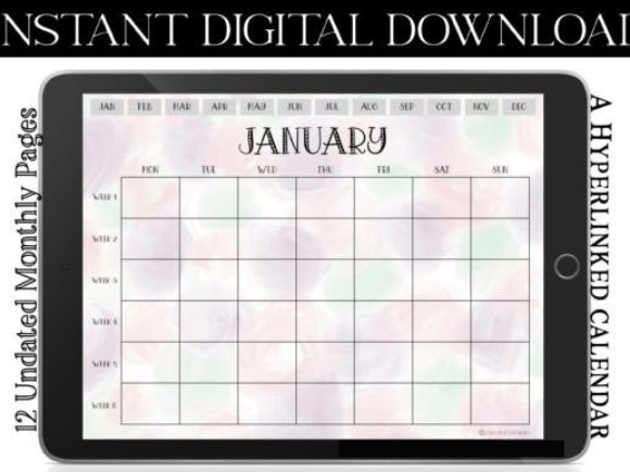 A minimalist mode soft pastel hazy retro vintage purple green orange grunge polka dot aesthetic undated digital monthly calendar, 6 weeks per month, which you can use for digitally planning out 12 months in apps like Goodnotes on the iPad / iPad Pro, Notability, Noteshelf, OneNote, Xodo and more. Includes 2 versions of the digital calendar – Monday starts & Sunday starts. You can relax, drink coffee, tea, hot chocolate, whilst planning with this easy to use month at a glance monthly calendar. A grungy light sweet polka dot background with a playful, cute retro black font. A bright bold modern sleek simple aesthetic background with a retro vintage black text for a cute classic playful adorable mood. The calendar has a horizontal landscape orientation. A calendar where you can see a month in a glance. A possible gift or present idea for Christmas / Xmas, Halloween, New Year, HSC, SATs, student planner, school, homeschool, uni, university, college, exam test prep, cramming sessions, assessment tasks and projects, work, freelancing, business plans, monthly overview pages, teacher, classroom teaching plans, meetings, notes and monthly key dates, scheduling, birthdays, to organise your monthly to do lists and goals across the month with this simple versatile calendar.